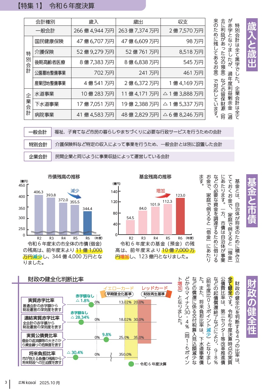 財政の健全化を判断する4つの比率は、全て健全です。令和6年度決算時点の実質公債費比率は、第三セクター等改革推進債などの起債償還終了などにより、9・8%(前年度比0・3ポイント減少)となりました。また、将来負担比率は、下水道事業債などの償還に係る交付税算入見込額減少などからマイナス30・4%(同1・6ポイント増加)となりました。