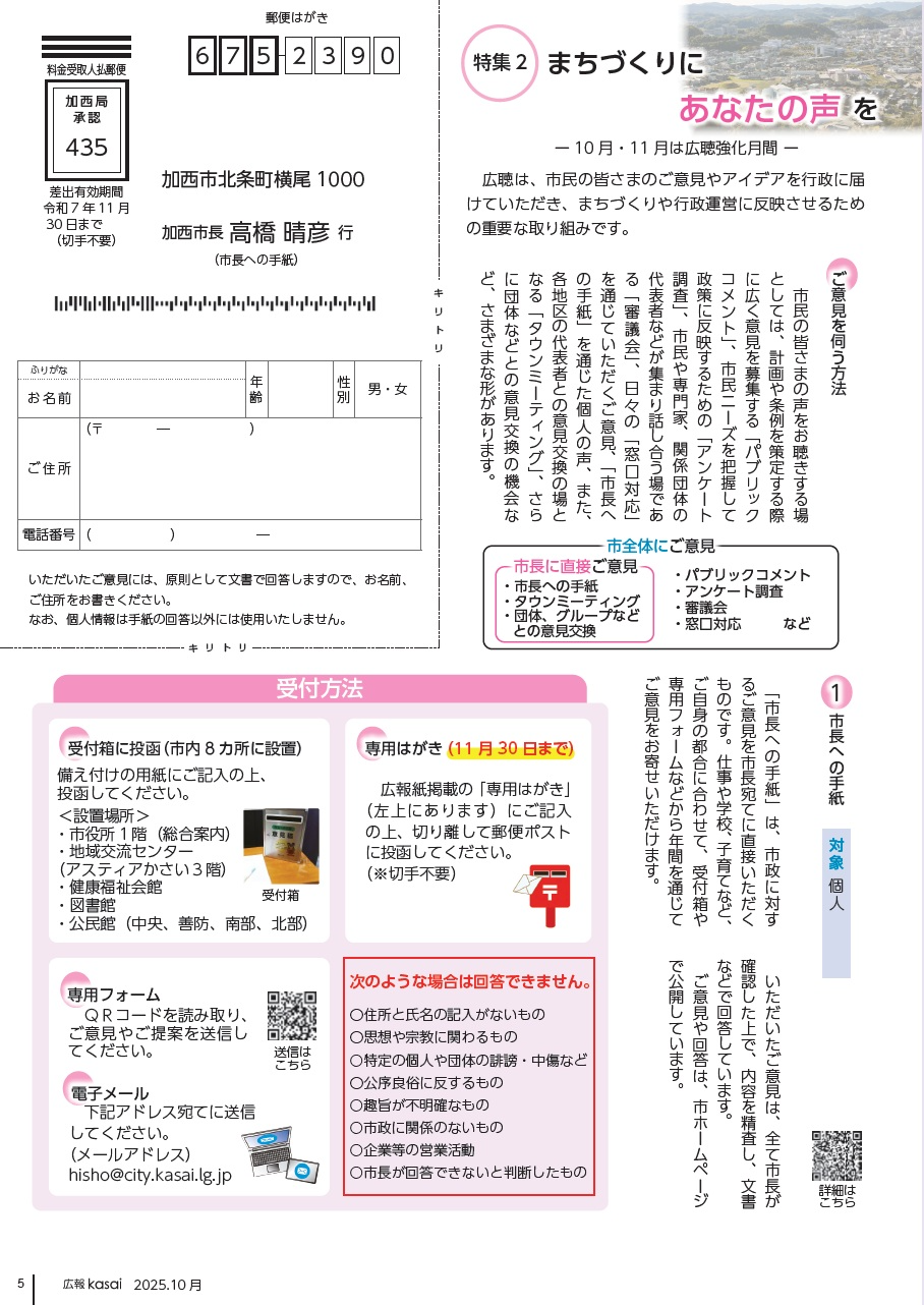 「市長への手紙」は、市政に対するご意見を市長宛てに直接いただくものです。仕事や学校、子育てなど、ご自身の都合に合わせて、受付箱や専用フォームなどから年間を通じてご意見をお寄せいただけます。