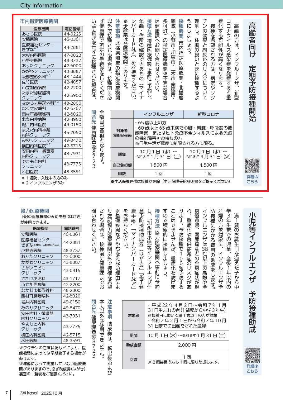 接種機関:市内指定医療機関・北播磨圏域(小野市・加東市・三木市・西脇市・多可町)の指定医療機関