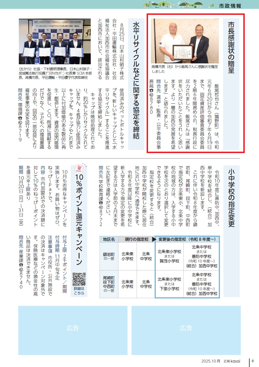 市長感謝状の贈呈 7/43 2025.10.01 兵庫県加西市 記事を読み上げる 飯尾哲也さん(鶉野町)は、令和元年6月20日から令和7年6月19日まで、固定資産評価審査委員会委員を2期6年間務められ、税務行政に尽力されました。飯尾さんは「感謝状をいただいたことをうれしく思います。より一層の加西の発展を希望します」と語られました。 問合先:選挙・監査・公平委員会事務局 【電話】42-8780 小児等インフルエンザ 予防接種助成 水平リサイクルなどに関する協定を締結