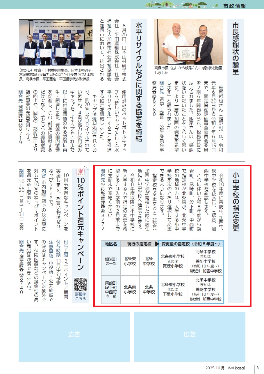 これに伴い令和8年度から鎮岩町、尾崎町、段下町、中西町で指定校が北条東小、北条中学校の地域の方は、入学する小中学校を次のとおり選択して変更できるようになります。
