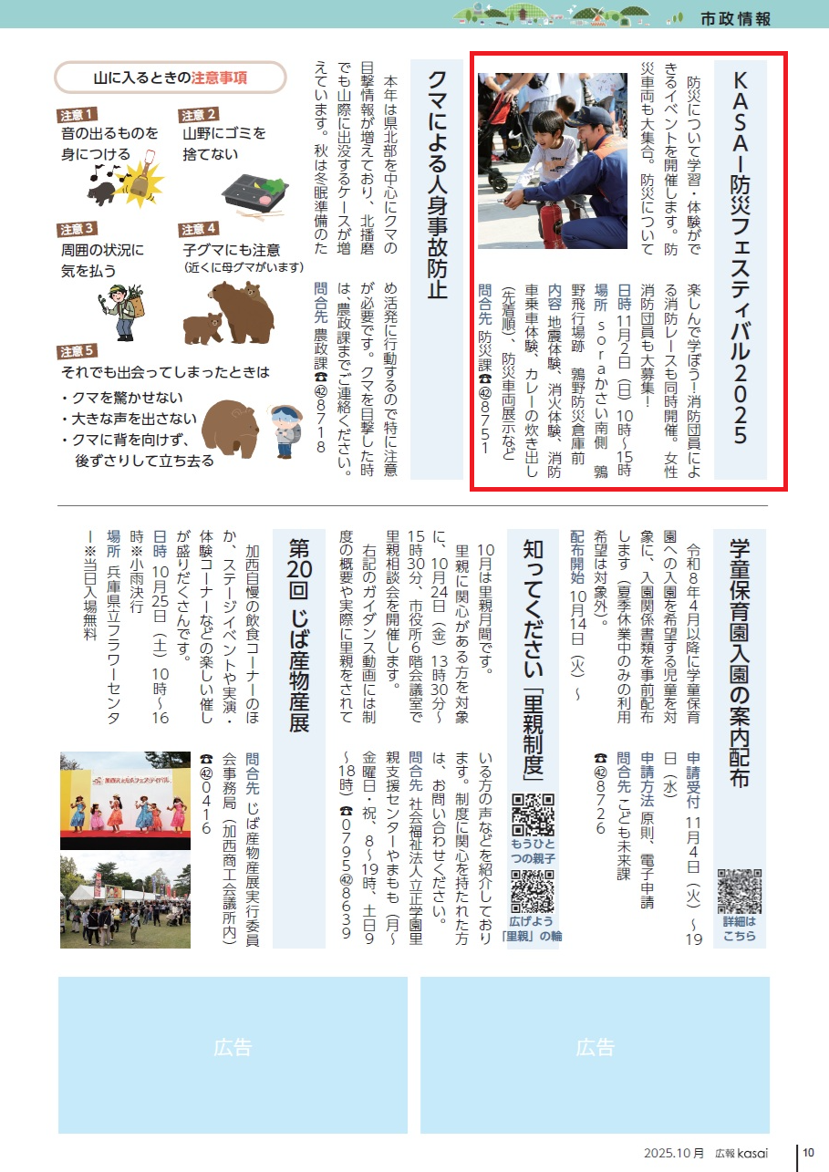 KASAI防災フェスティバル2025 14/43 2025.10.01 兵庫県加西市 記事を読み上げる 防災について学習・体験ができるイベントを開催します。防災車両も大集合。防災について楽しんで学ぼう!消防団員による消防レースも同時開催。女性消防団員も大募集! 日時:11月2日(日)10時~15時 場所:soraかさい南側 鶉野飛行場跡 鶉野防災倉庫前 内容:地震体験、消火体験、消防車乗車体験、カレーの炊き出し(先着順)、防災車両展示など 問合先:防災課 【電話】42-8751 グローバルセンターからのお知らせ クマによる人身事故防止