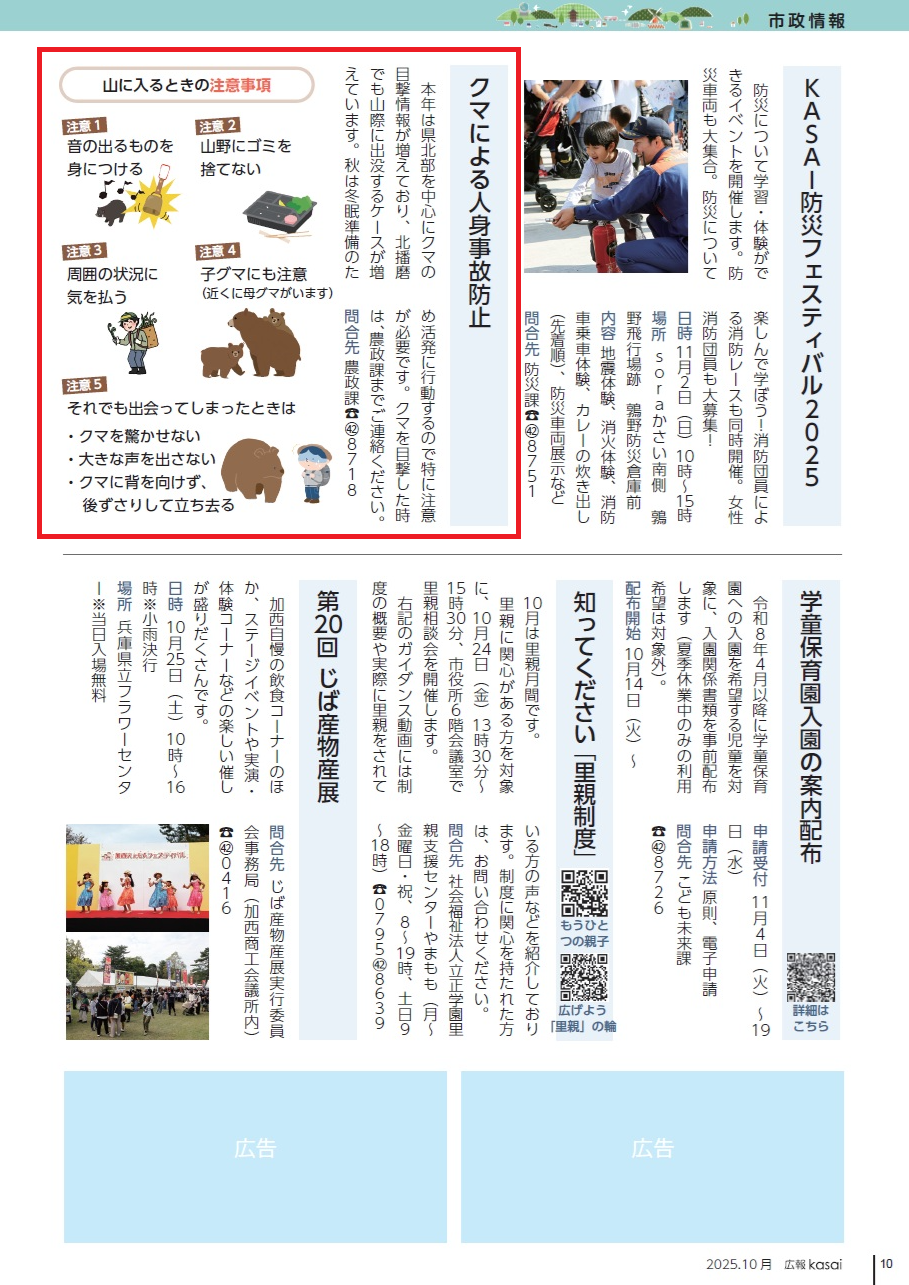 本年は県北部を中心にクマの目撃情報が増えており、北播磨でも山際に出没するケースが増えています。秋は冬眠準備のため活発に行動するので特に注意が必要です。クマを目撃した時は、農政課までご連絡ください。