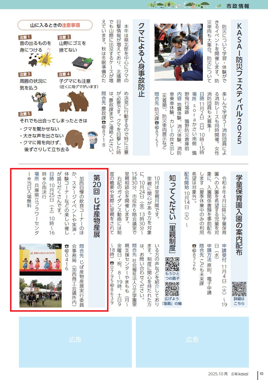 第20回 じば産物産展 18/43 2025.10.01 兵庫県加西市 記事を読み上げる 加西自慢の飲食コーナーのほか、ステージイベントや実演・体験コーナーなどの楽しい催しが盛りだくさんです。 日時:10月25日(土)10時~16時 ※小雨決行 場所:兵庫県立フラワーセンター ※当日入場無料 問合先:じば産物産展実行委員会事務局(加西商工会議所内) 【電話】42-0416 知ってください「里親制度」 第59回 加西市文化祭