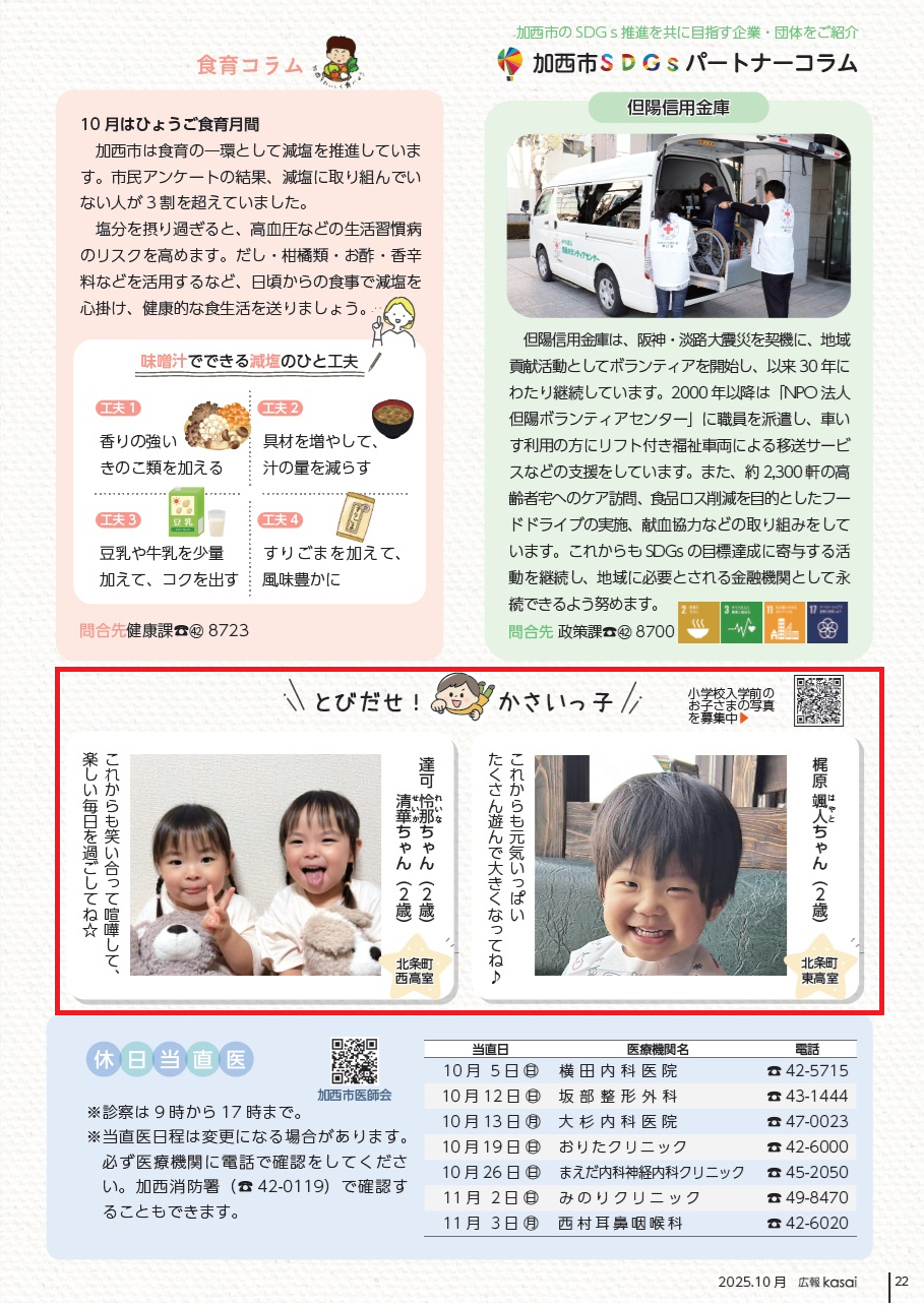 とびだせ! かさいっ子 37/43 2025.10.01 兵庫県加西市 記事を読み上げる ■小学校入学前のお子さまの写真を募集中 【URL】https://logoform.jp/f/hFEHH/28579?key=803469177d4288f4a1e8d29f54c9b025fa65976cce917fc6efff12aa11b51ef4 食育コラム 休日当直医