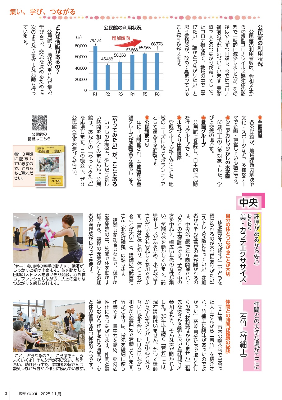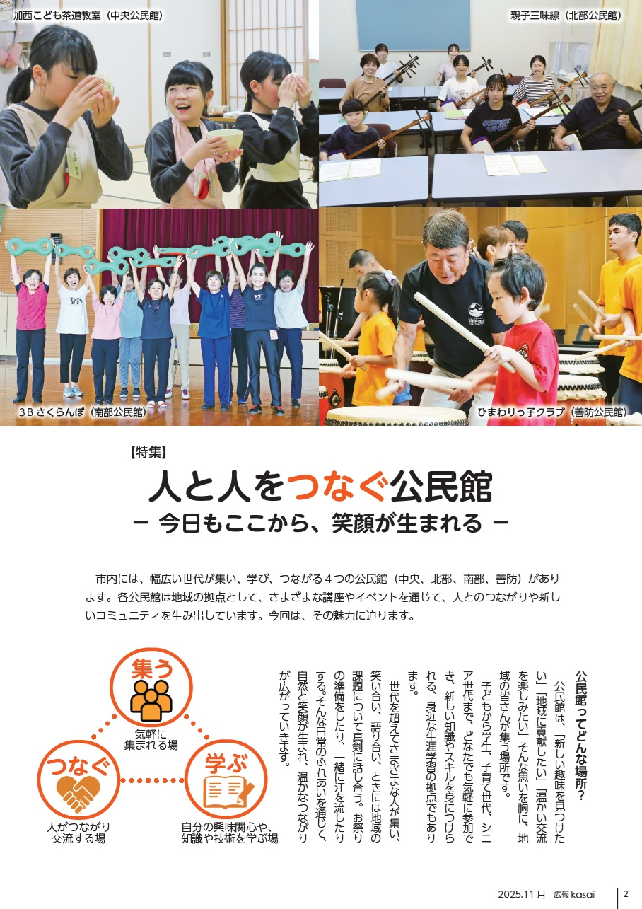 市内には、幅広い世代が集い、学び、つながる4つの公民館(中央、北部、南部、善防)があります。各公民館は地域の拠点として、さまざまな講座やイベントを通じて、人とのつながりや新しいコミュニティを生み出しています。今回は、その魅力に迫ります。