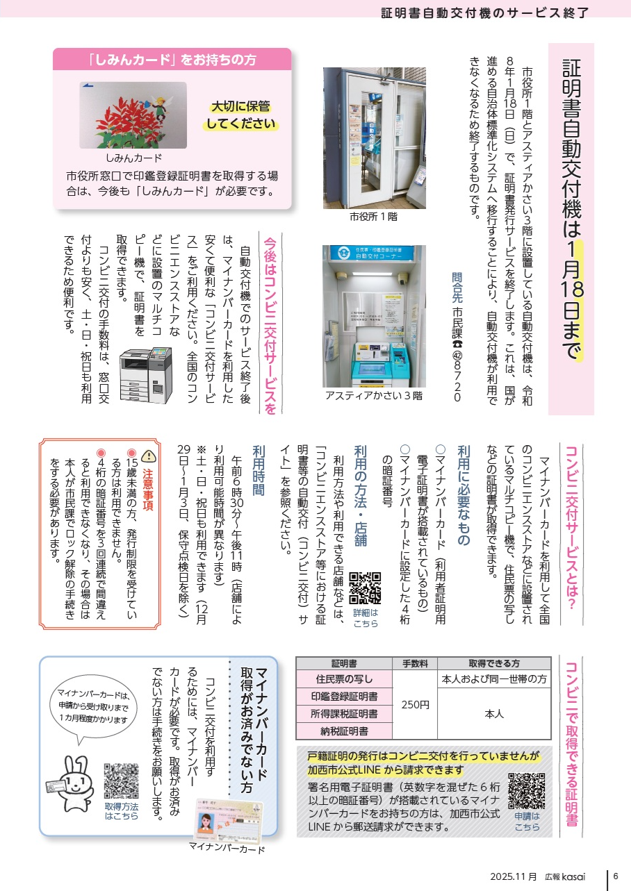 市役所1階とアスティアかさい3階に設置している自動交付機は、令和8年1月18日(日)で、証明書発行サービスを終了します。これは、国が進める自治体標準化システムへ移行することにより、自動交付機が利用できなくなるため終了するものです。