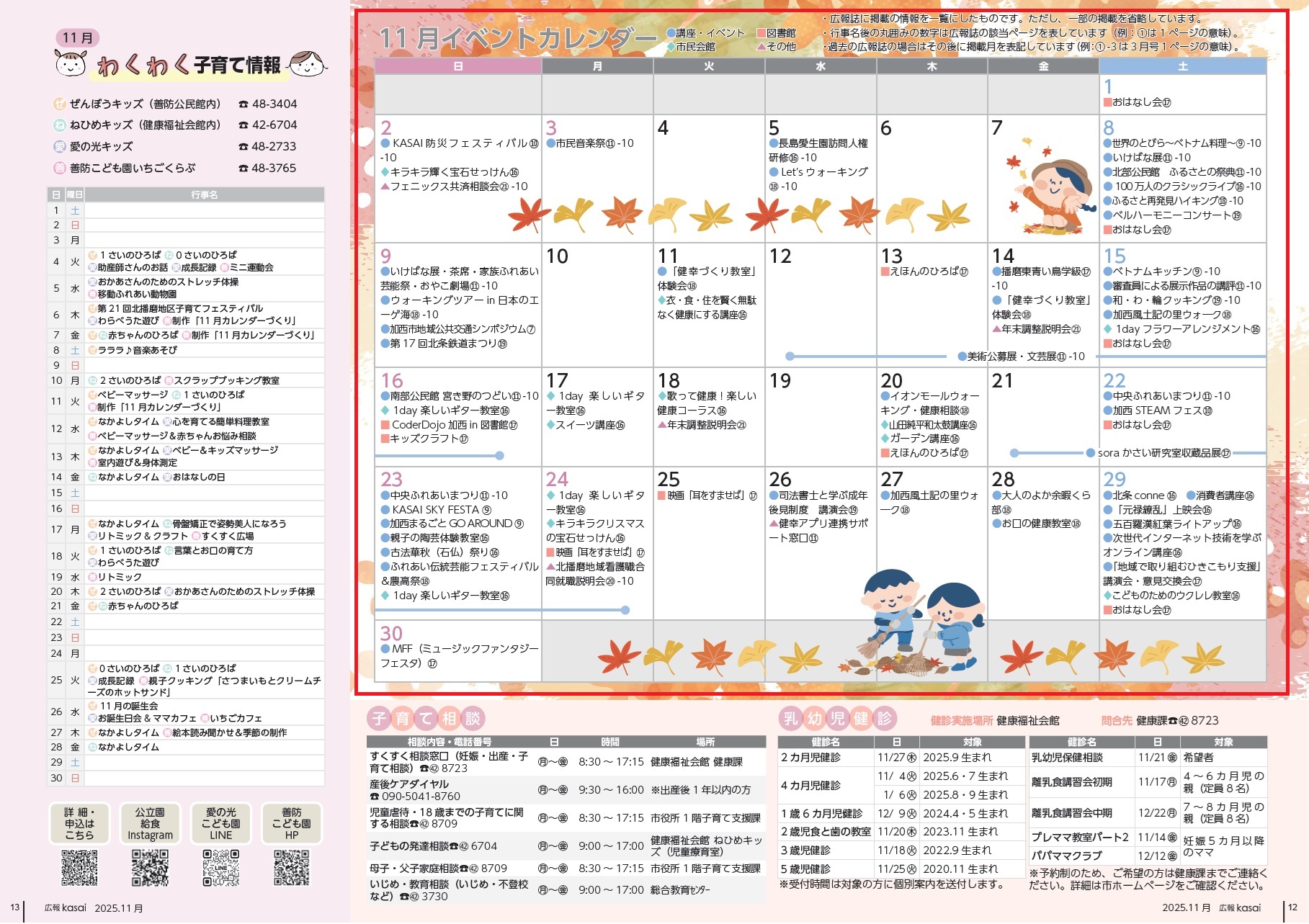 11月イベントカレンダー 21/43 2025.11.01 兵庫県加西市 記事を読み上げる ・広報誌に掲載の情報を一覧にしたものです。ただし、一部の掲載を省略しています。 ・行事名後の丸囲みの数字は広報誌の該当ページを表しています(例:(1)は1ページの意味)。 ・過去の広報誌の場合はその後に掲載月を表記しています(例:(1)-3は3月号1ページの意味)。 ●:講座・イベント ♦:市民会館 ■:図書館 ★:COCOKARA ▲:その他 女性に対する暴力をなくす運動 乳幼児健診
