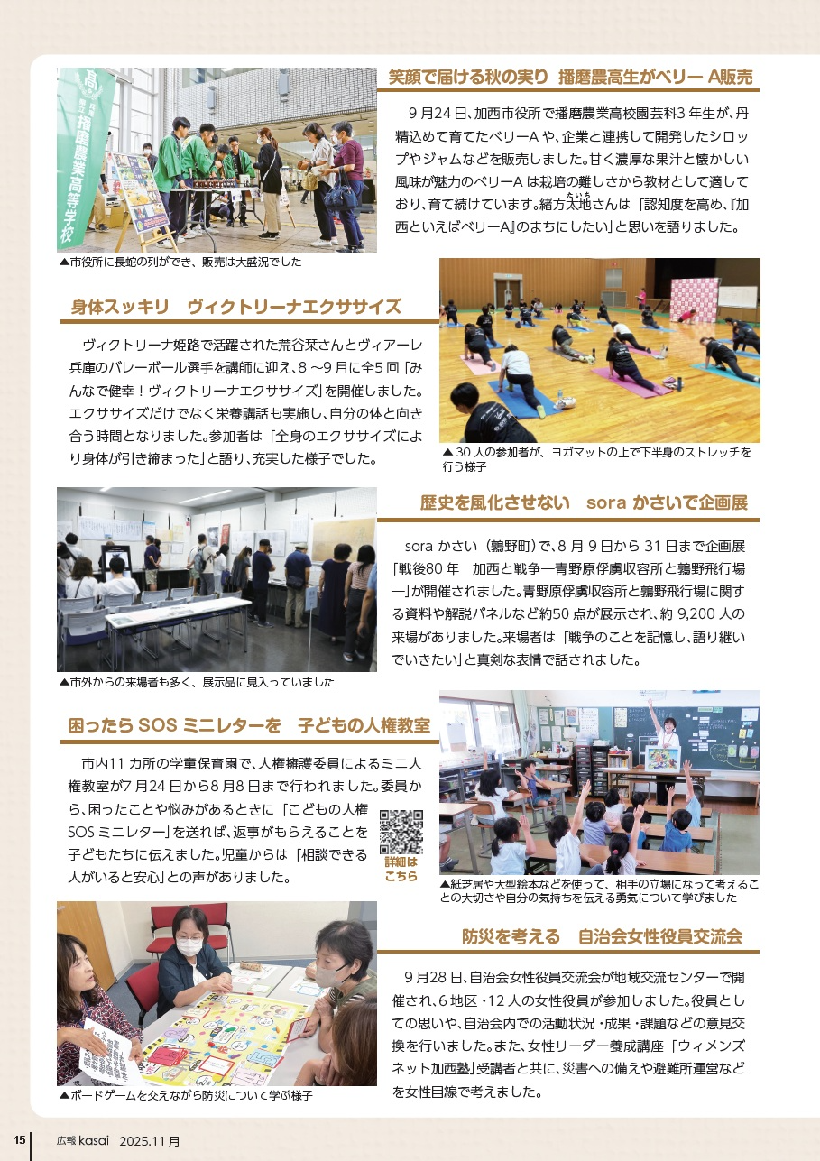 soraかさい(鶉野町)で、8月9日から31日まで企画展「戦後80年 加西と戦争―青野原俘虜収容所と鶉野飛行場―」が開催されました。青野原俘虜収容所と鶉野飛行場に関する資料や解説パネルなど約50点が展示され、約9,200人の来場がありました。来場者は「戦争のことを記憶し、語り継いでいきたい」と真剣な表情で話されました。