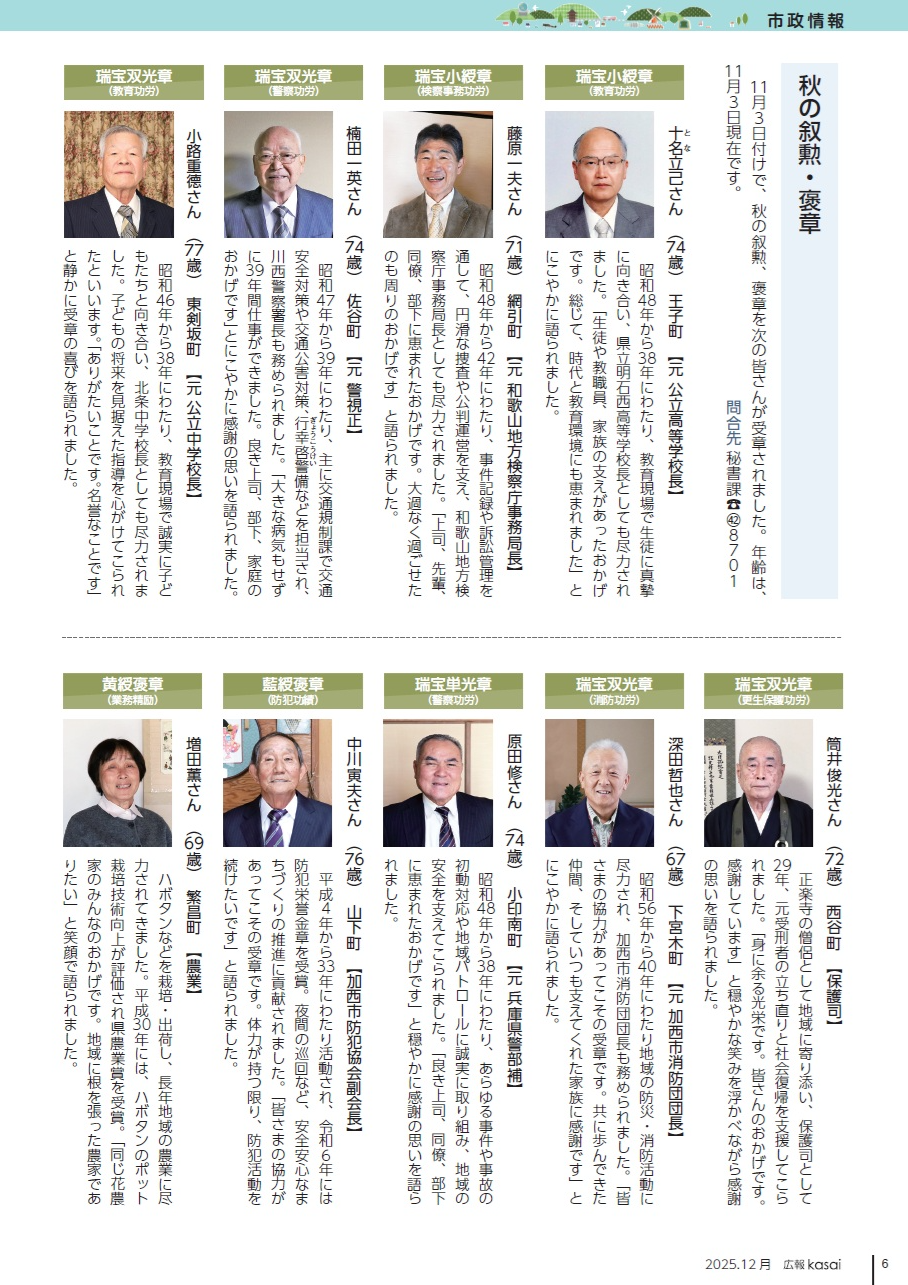 11月3日付けで、秋の叙勲、褒章を次の皆さんが受章されました。年齢は、11月3日現在です。