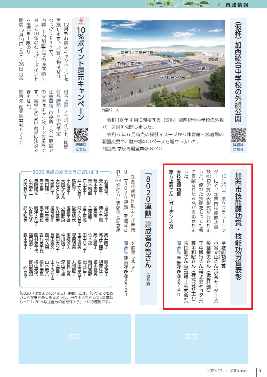 加西市技能顕功賞・技能功労賞表彰 9/38 2025.12.01 兵庫県加西市 記事を読み上げる 10月25日、県立フラワーセンターにて、加西市技能顕功賞・技能功労賞の表彰式が行われました。優れた技能をもって社会に貢献された6名が表彰されました。 ■技能顕功賞 ・志方正義さん(ガーデン志方) ■技能功労賞 ・小谷文山(ぶんざん)さん(小谷モータース) ・後藤敏夫さん(後藤住建) ・正中博行さん(株式会社コタニ) ・藤本和昭さん(株式会社千石) ・吉田剛さん(是常精工株式会社) 問合先:産業課 【電話】42-8740 10%ポイント還元キャンペーン 「8020運動」達成者の皆さん