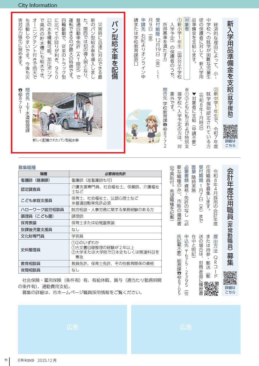 バン型給水車を配備 15/38 2025.12.01 兵庫県加西市 記事を読み上げる 災害時に迅速に対応できる最新のバン型給水車を導入しました。関西では初の導入例となり、普通自動車免許(AT限定)で運転できるのが最大の特徴です。四輪駆動で、従来のトラック型に比べて小回りが利き、950リットルの水を積載可能。加圧ポンプで高所の貯水槽にも給水でき、オーニングテント付きで雨天でも活動しやすいです。今後も災害対応力強化に努めます。 問合先:上下水道管理課 【電話】42-8791 新入学用品準備金を支給(就学援助) 会計年度任用職員(非常勤職員)募集