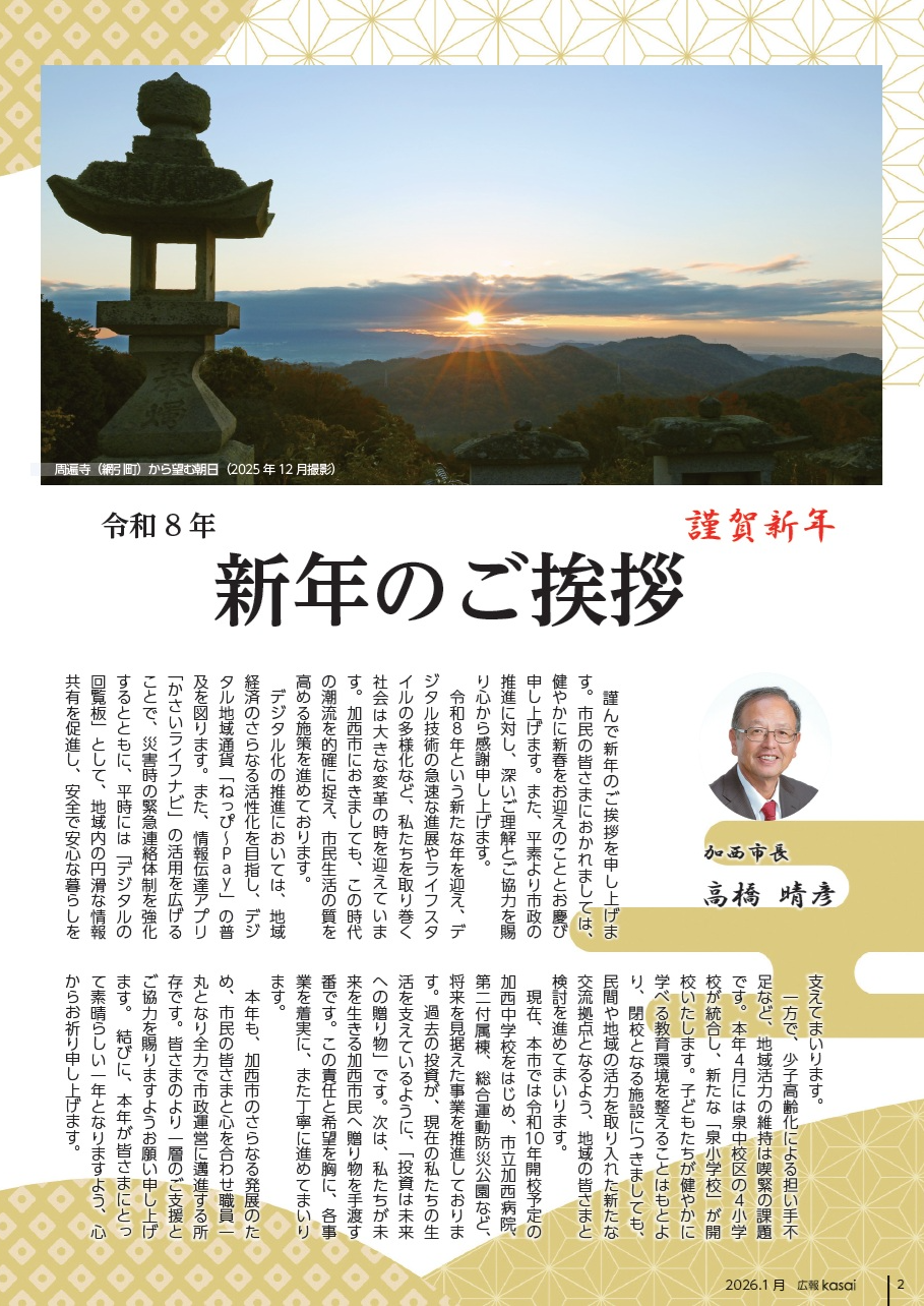 令和8年という新たな年を迎え、デジタル技術の急速な進展やライフスタイルの多様化など、私たちを取り巻く社会は大きな変革の時を迎えています。加西市におきましても、この時代の潮流を的確に捉え、市民生活の質を高める施策を進めております。