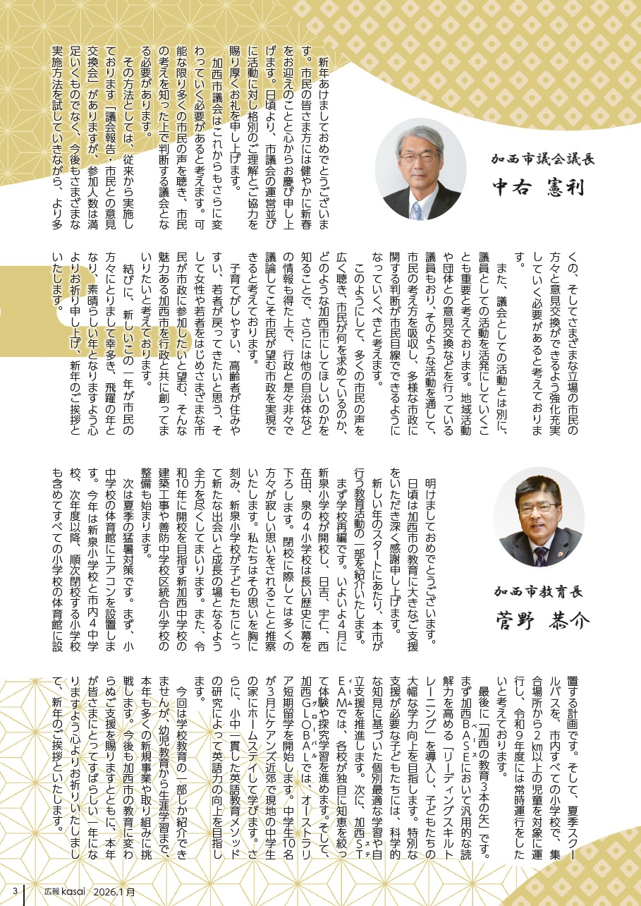 今回は学校教育の一部しか紹介できませんが、幼児教育から生涯学習まで、本年も多くの新規事業や取り組みに挑戦します。今後も加西市の教育に変わらぬご支援を賜りますとともに、本年が皆さまにとってすばらしい一年になりますよう心よりお祈りいたしまして、新年のご挨拶といたします。
