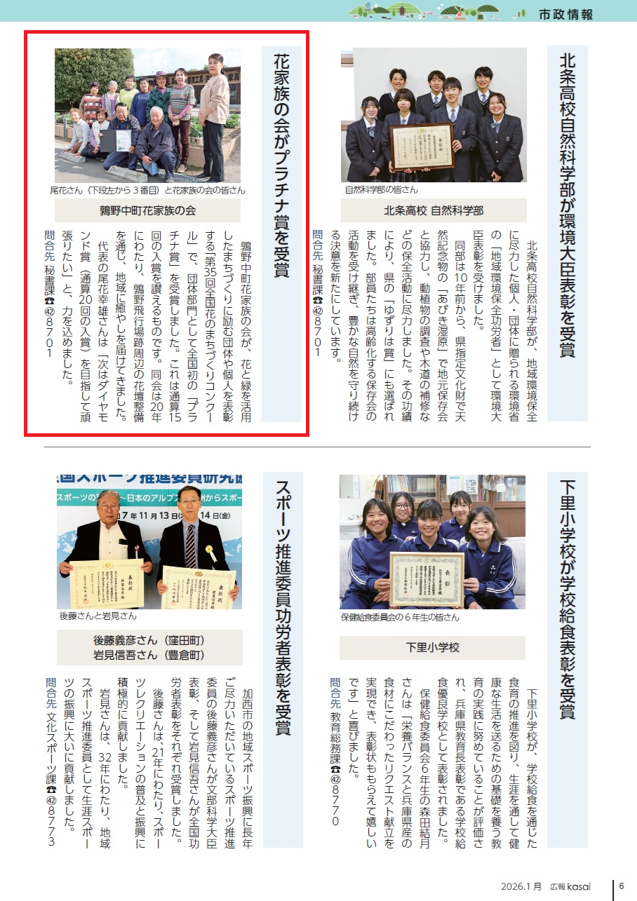 鶉野中町花家族の会が、花と緑を活用したまちづくりに励む団体や個人を表彰する「第35回全国花のまちづくりコンクール」で、団体部門として全国初の「プラチナ賞」を受賞しました。これは通算15回の入賞を讃えるものです。同会は20年にわたり、鶉野飛行場跡周辺の花壇整備を通じ、地域に癒やしを届けてきました。