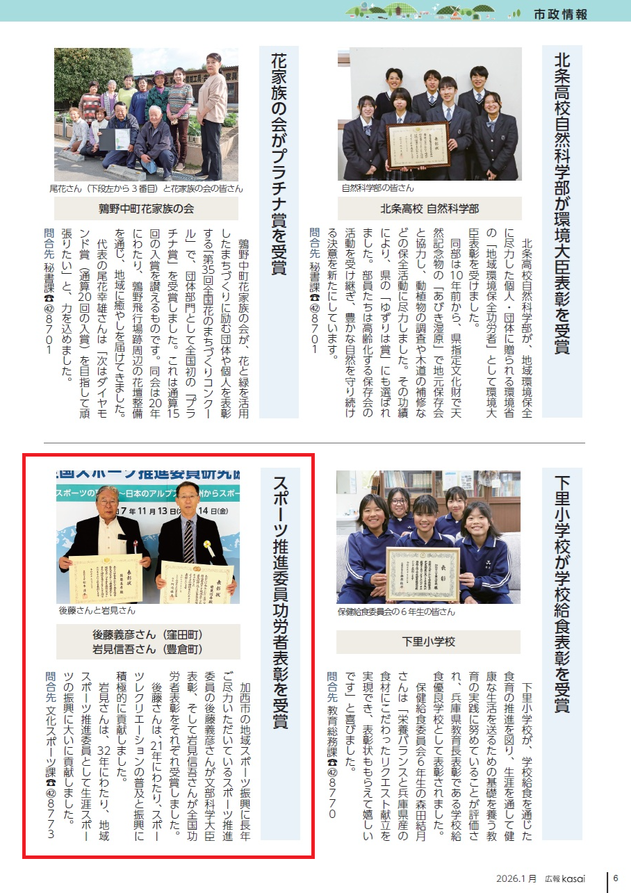 加西市の地域スポーツ振興に長年ご尽力いただいているスポーツ推進委員の後藤義彦さんが文部科学大臣表彰、そして岩見信吾さんが全国功労者表彰をそれぞれ受賞しました。
