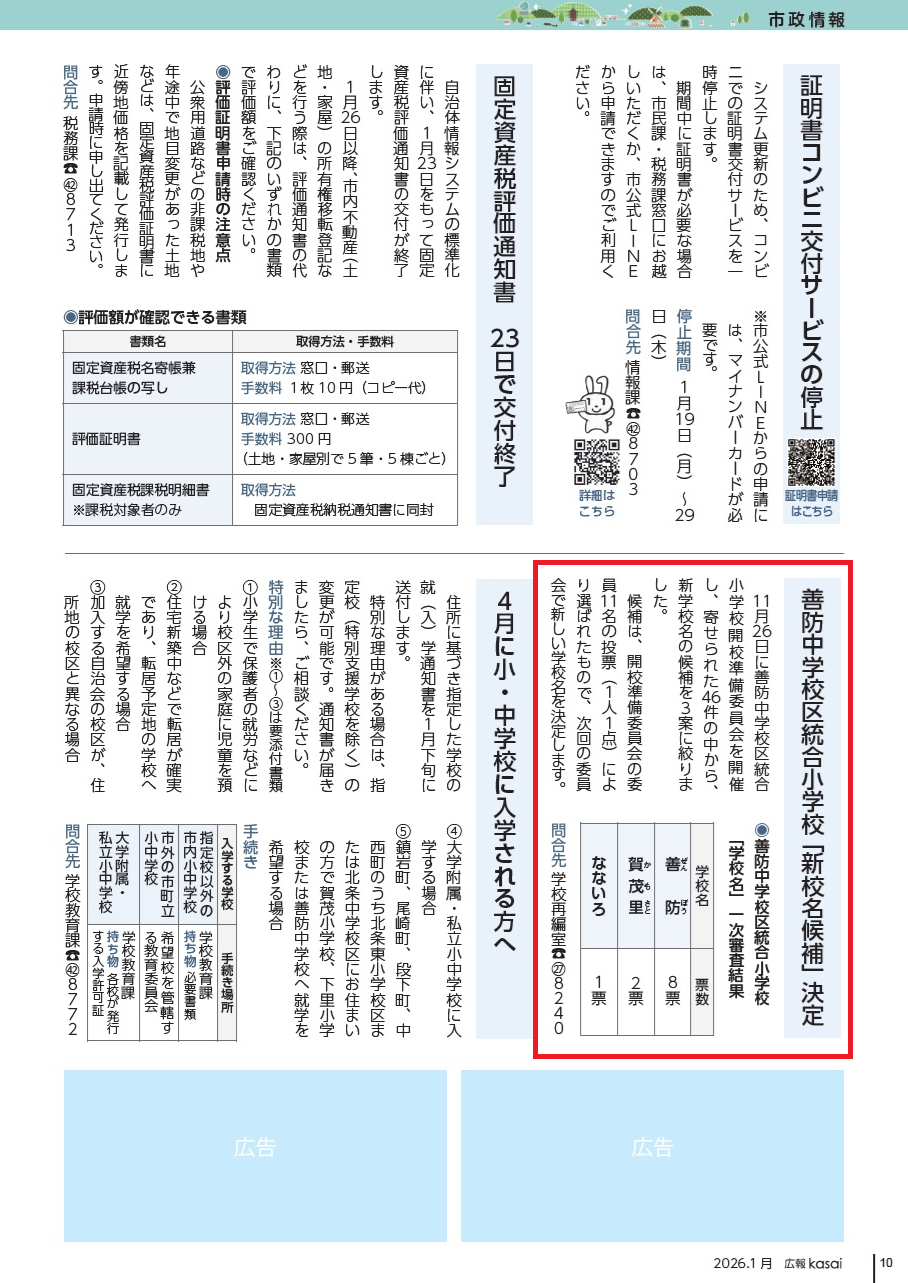善防中学校区統合小学校「新校名候補」決定 14/39 2026.01.01 兵庫県加西市 記事を読み上げる 11月26日に善防中学校区統合小学校開校準備委員会を開催し、寄せられた46件の中から、新学校名の候補を3案に絞りました。 候補は、開校準備委員会の委員11名の投票(1人1点)により選ばれたもので、次回の委員会で新しい学校名を決定します。 ◆善防中学校区統合小学校「学校名」一次審査結果 〈学校名・票数〉 善防(ぜんぼう):8票 賀茂里(かもさと):2票 なないろ:1票 問合先:学校再編室 【電話】27-8240 固定資産税評価通知書 23日で交付終了 4月に小・中学校に入学される方へ