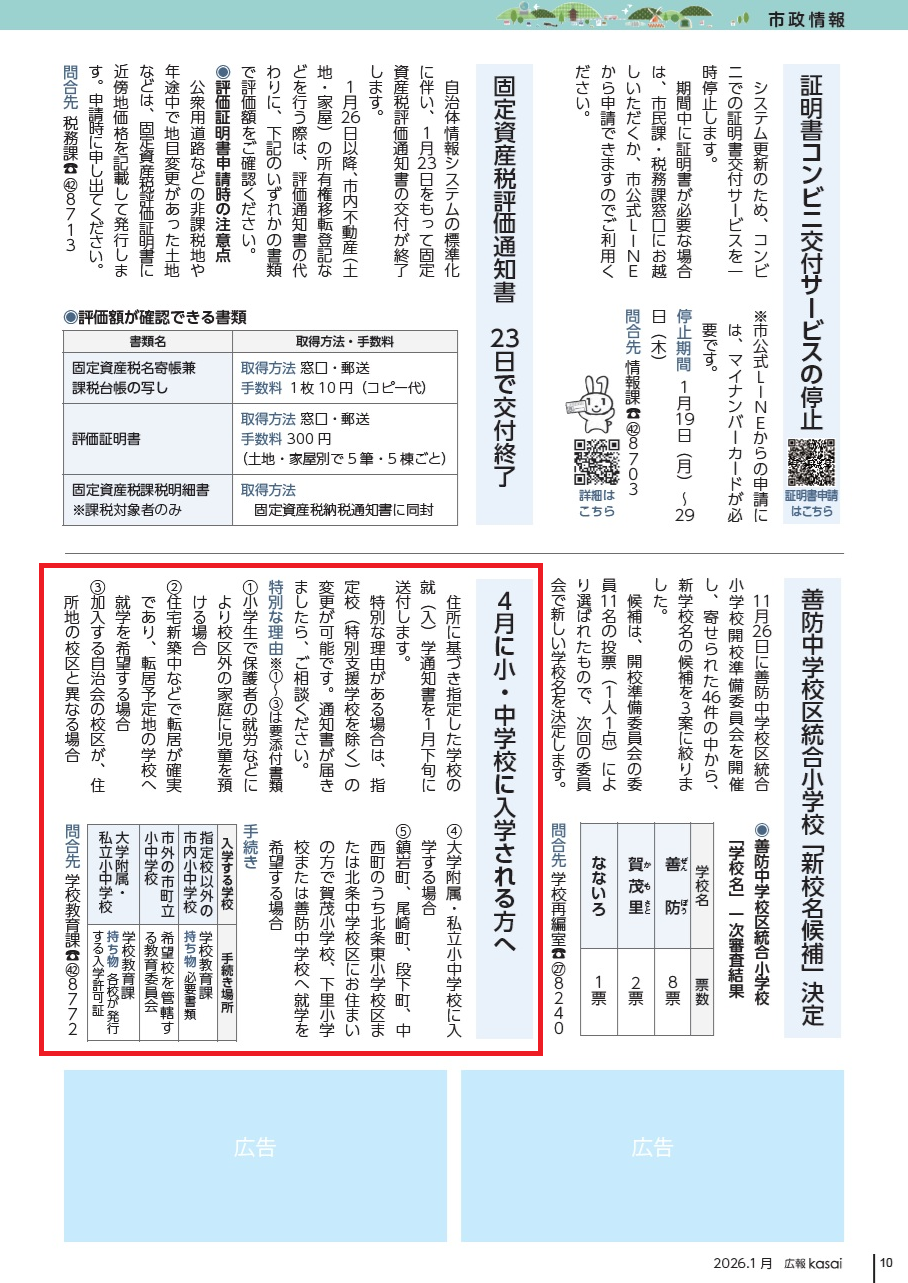 住所に基づき指定した学校の就(入)学通知書を1月下旬に送付します。