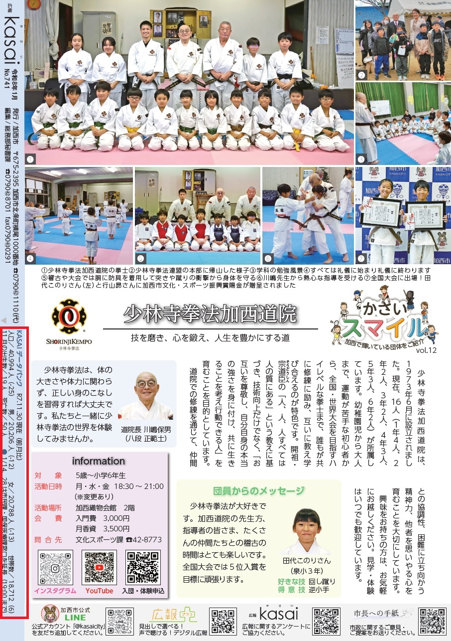 KASAIデータバンク 38/39 2026.01.01 兵庫県加西市 記事を読み上げる R7.11.30現在(前月比) 人口:40,994人(-25) 男:20,206人(-12) 女:20,788人(-13) 世帯数:18,712(6) 11月の 出生数:19人 死亡数:50人 ◎1/14、28は市民課・国保医療課窓口を延長(19:00まで) かさいスマイル vol.12 その他のお知らせ(広報かさい 2026年1月号)
