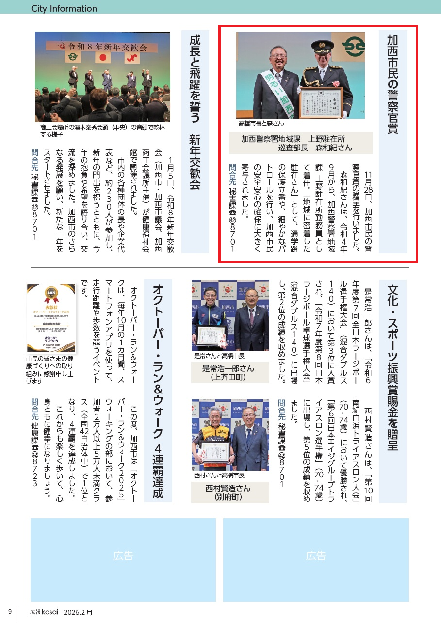 加西市民の警察官賞 12/40 2026.02.01 兵庫県加西市 記事を読み上げる ■加西警察署地域課 上野駐在所 巡査部長 森和紀さん 11月28日、加西市民の警察官賞の贈呈を行いました。 森和紀さんは、令和4年9月から、加西警察署地域課上野駐在所勤務員として着任。「地域に密着した駐在さん」として、通学路の保護立番や、細やかなパトロールを行い、加西市民の安全安心の確保に大きく寄与されました。 問合先:秘書課 【電話】42-8701 令和8年4月採用 会計年度任用職員 募集 成長と飛躍を誓う 新年交歓会