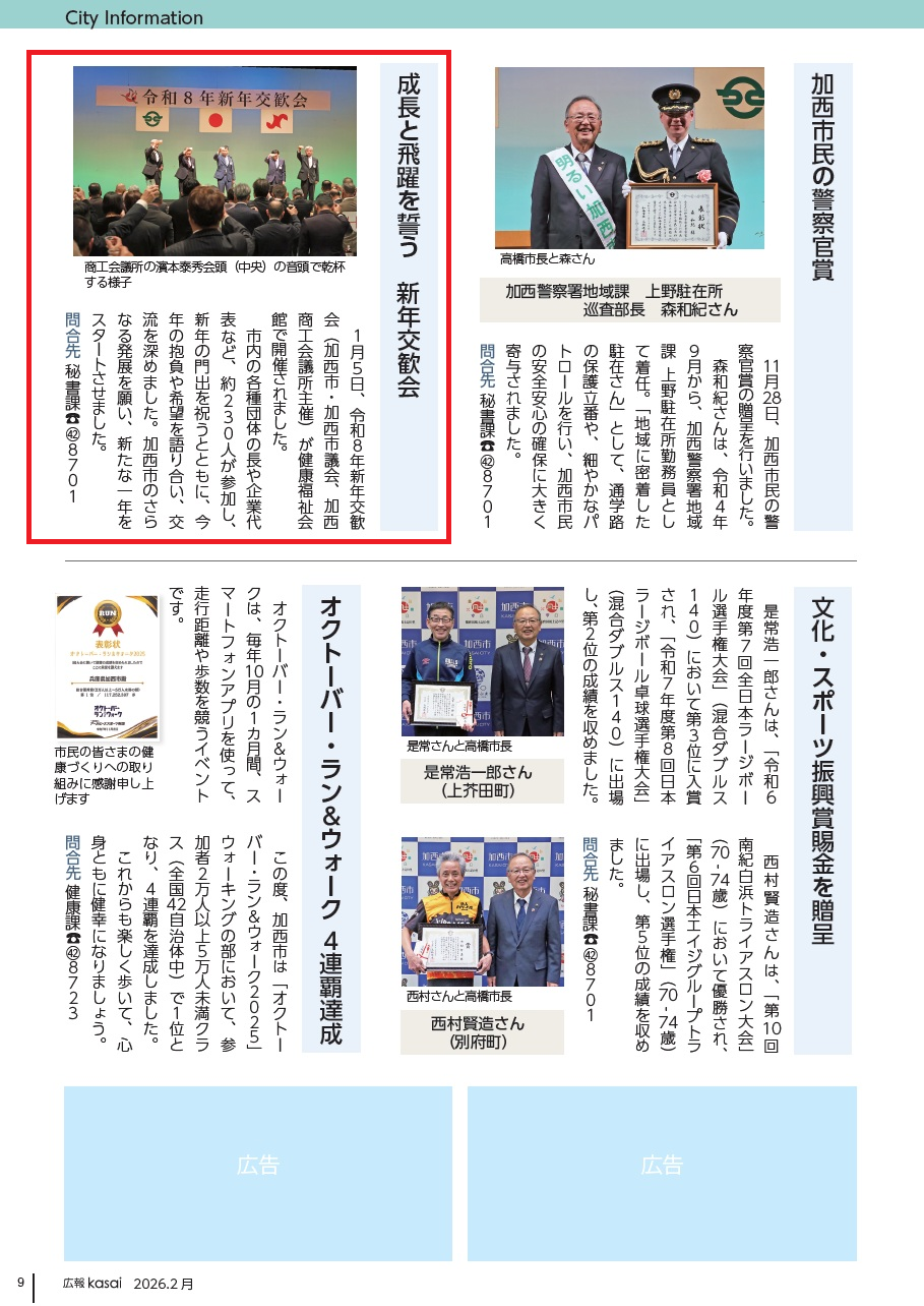 成長と飛躍を誓う 新年交歓会 13/40 2026.02.01 兵庫県加西市 記事を読み上げる 1月5日、令和8年新年交歓会(加西市・加西市議会、加西商工会議所主催)が健康福祉会館で開催されました。 市内の各種団体の長や企業代表など、約230人が参加し、新年の門出を祝うとともに、今年の抱負や希望を語り合い、交流を深めました。加西市のさらなる発展を願い、新たな一年をスタートさせました。 問合先:秘書課 【電話】42-8701 加西市民の警察官賞 文化・スポーツ振興賞賜金を贈呈