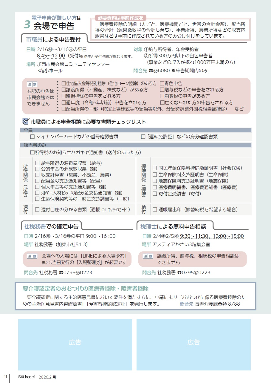 医療費控除の明細(人ごと、医療機関ごと、世帯の合計金額)、配当所得の合計(源泉徴収税の合計も含む)、事業所得、農業所得などの収支内訳書などは事前に作成されている方のみ受け付けをしています。