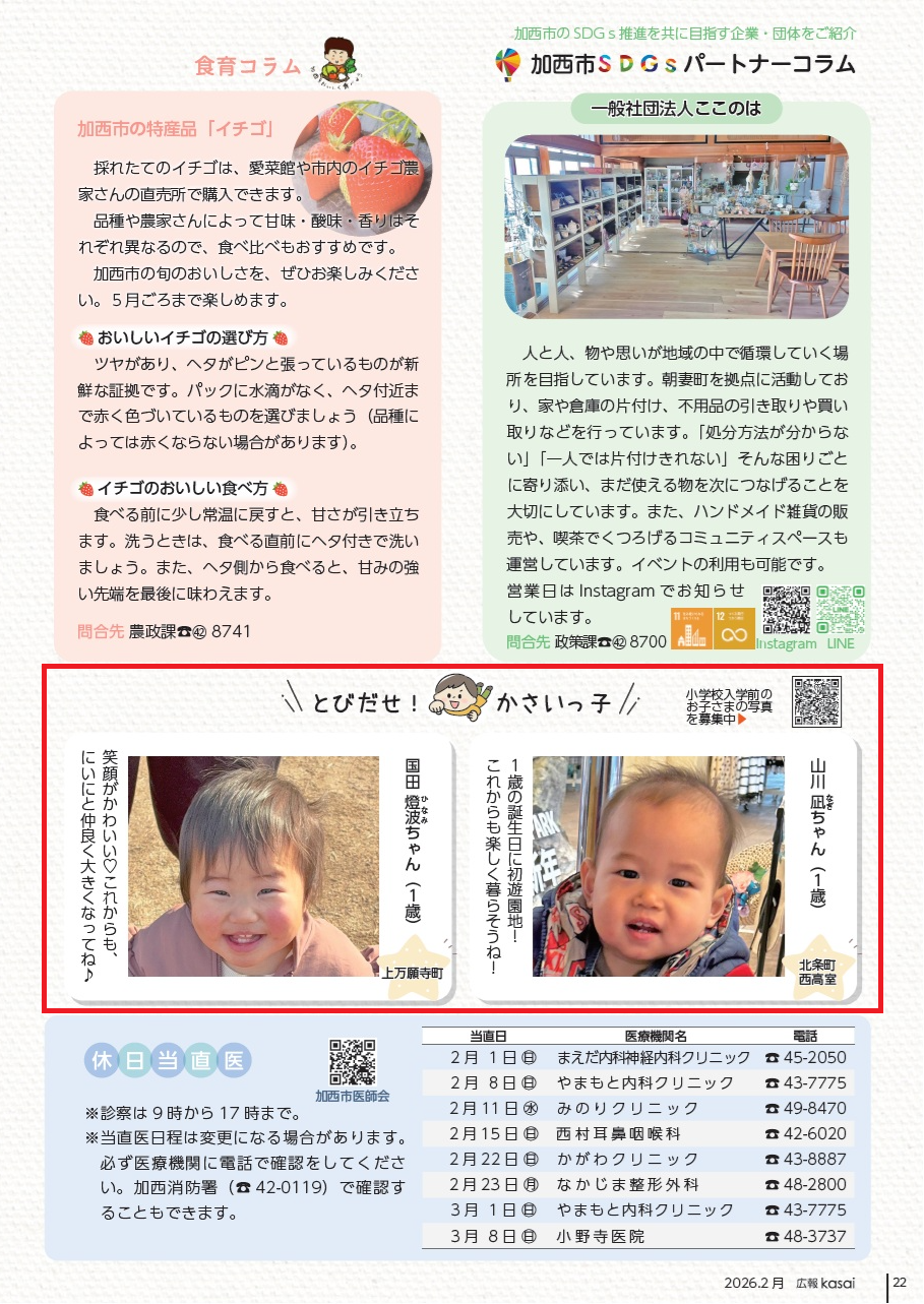 とびだせ! かさいっ子 34/40 2026.02.01 兵庫県加西市 記事を読み上げる ◎小学校入学前のお子さまの写真を募集中 【URL】https://logoform.jp/f/hFEHH/28579?key=803469177d4288f4a1e8d29f54c9b025fa65976cce917fc6efff12aa11b51ef4 食育コラム 休日当直医
