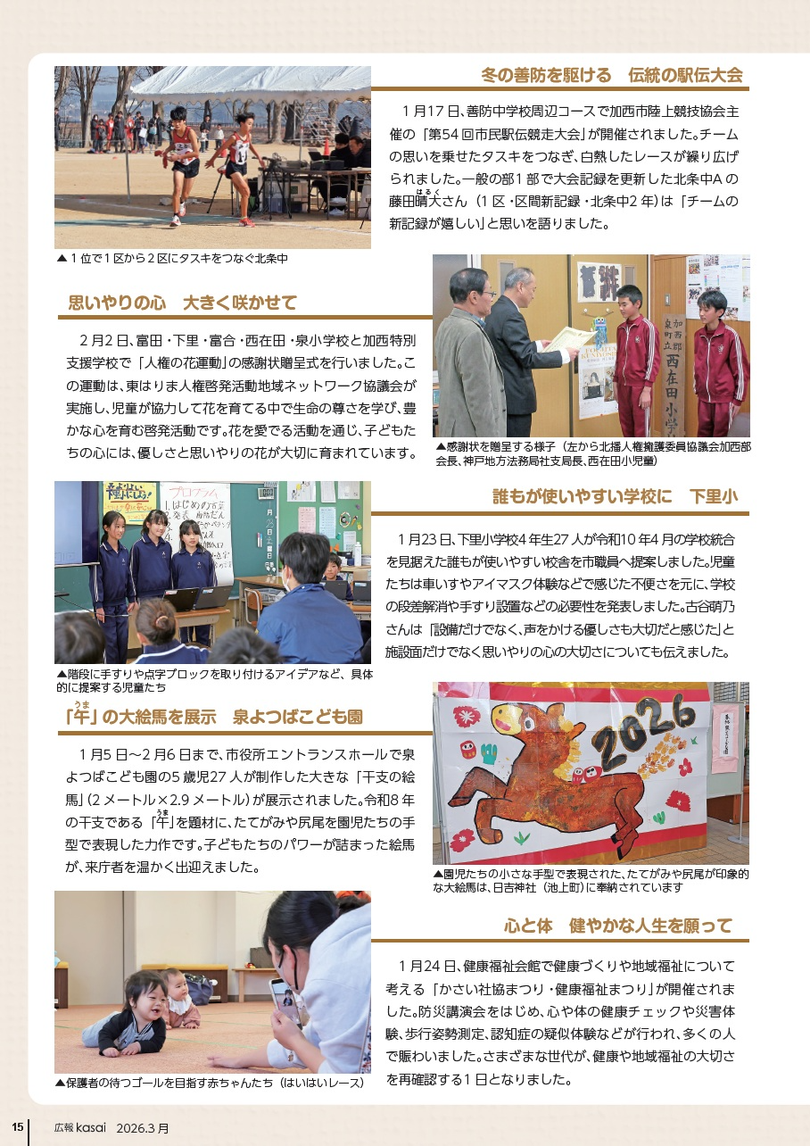 1月24日、健康福祉会館で健康づくりや地域福祉について考える「かさい社協まつり・健康福祉まつり」が開催されました。防災講演会をはじめ、心や体の健康チェックや災害体験、歩行姿勢測定、認知症の疑似体験などが行われ、多くの人で賑わいました。さまざまな世代が、健康や地域福祉の大切さを再確認する1日となりました。