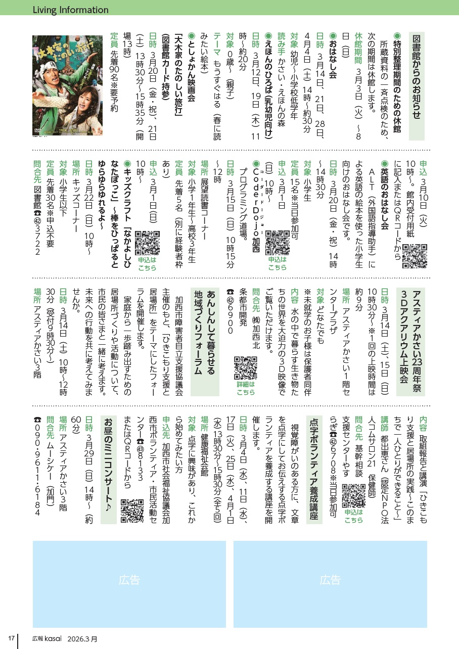 申込:3月10日(火)10時~。館内受付用紙に記入またはQRコードから
