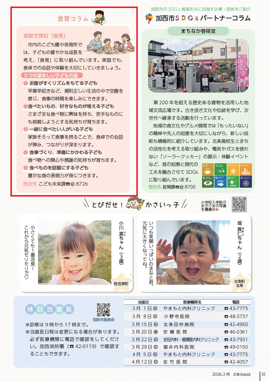 市内のこども園や保育所では、子どもの健やかな成長を考え、「食育」に取り組んでいます。家庭でも、食卓での会話や体験を大切にしていきましょう。